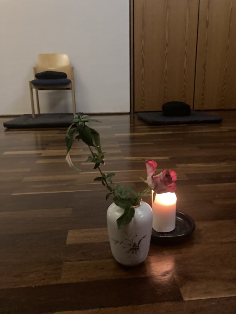 Wir sitzen in Stille auf Kissen, Bänkchen oder Stühlen dreimal 2omin . Nach jeder Zeit des Sitzen folgt ein 5minütiges gemeinsames Gehen. Zum Ablauf gehört das Rezitieren von Texten. Für regelmässig Übende besteht die Möglichkeit während des Sitzen für ein kurzes Gespräch im Blick auf die Übung.